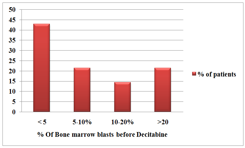 The study population consisted 9 men and 5 women, with median age for patients suffering from MDS and AML was found to be 57 and 63 respectively. As per the criteria of the International prognostic scoring system (IPSS) 9 patients come within intermediate risk 1 and 2 patients within intermediate risk 2 (Table 1). From this classification, it was found that more number of patients are included in intermediate risk 1. According to the WHO classification of MDS it was found that 4 patients were in RAEB 1, 4 patients in RAEB 2 and 3 patients in RCMD. According to the FAB classification of AML, 2 patients were included in M1 and 1 patient in M2. Karyotype of patients with MDS and AML, Data shows a majority of patients having good karyotype and two MDS patients with abnormal karyotype. Fig 1 illustrates the percentage of bone marrow blasts in patients before Decitabine therapy. From this data it was found that majority of MDS patients with <5% bone marrow blasts and AML patients with >20 % of bone marrow blasts.