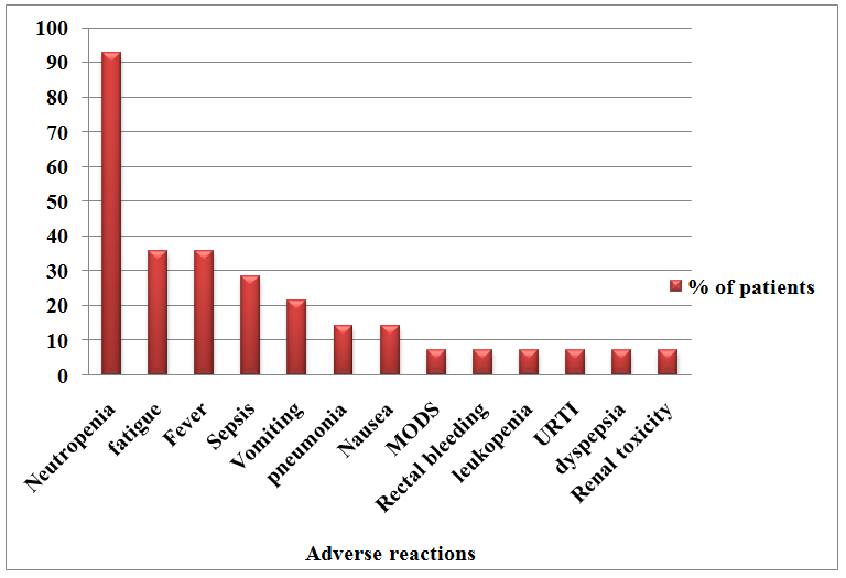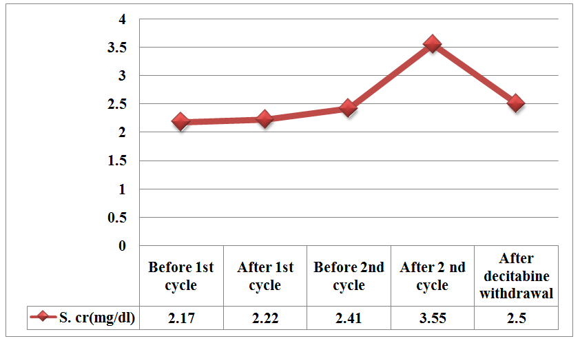 Fig 2 shows frequency distribution of various adverse reactions that occurred during Decitabine chemotherapy in MDS and AML patients. Most common adverse drug reaction found in patients treated with Decitabine was neutropenia which belongs to the grade 2, grade 3, grade 4 and grade 5 of adverse drug reaction categorization (Table 3). Grade 5 adverse drug reactions included sepsis. Fatigue, Fever and Pneumonia came under grade 2 and grade 3 categories. Nausea and vomiting were observed only in limited no. of patients and belongs to the Grade 1 and 2. We also noticed the worsening of pre-existing renal dysfunction (Figure 3) observed in one patient after the second cycle of Decitabine which reversed upon stopping the drug.