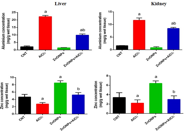 Fig. 1: Accumulation of aluminum and zinc in liver and kidney tissue after daily treatment with zinc oxide nanoparticles (ZnO NPs) and aluminum chloride, (AlCl3) for 6 w. Data are expressed as the mean±SD (n = 7). ap<0.05 vs, the Control Group; bp<0.05 vs. the AlCl3-treated rats using Tukey post hoc test