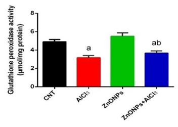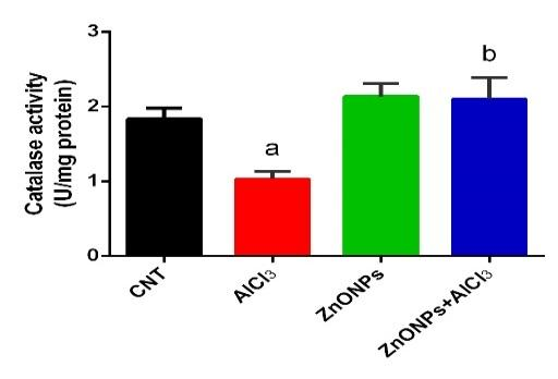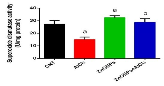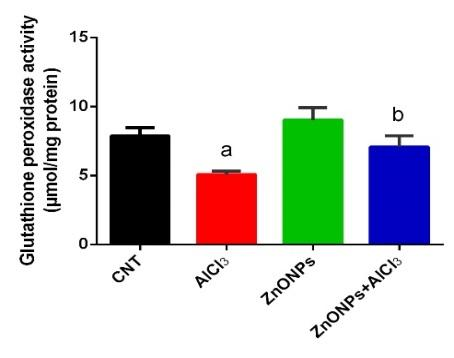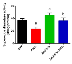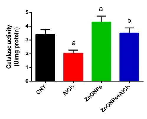 Fig. 3: Effect of zinc oxide nanoparticles (ZnO NPs) and/or aluminum chloride (AlCl3) after daily treatment for 6 w, on antioxidant enzymes activity in liver and kidney of adult male rats. Data are expressed as the mean±SD (n = 7). a p<0.05 vs. the control group; b p<0.05 vs. the AlCl3-treated rats using Tukey post hoc test.