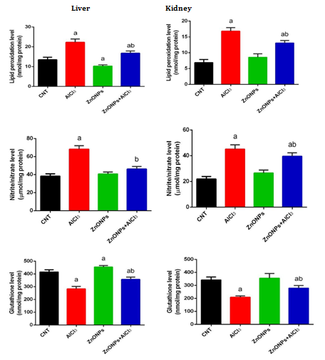 Fig. 2: Effect of zinc oxide nanoparticles (ZnO NPs) and/or aluminum chloride (AlCl3) after daily treatment for 6 w, on lipid peroxidation (LPO), nitric oxide (NO) and glutathione (GSH) levels in liver and kidney of adult male rats. Data are expressed as the mean ±SD (n= 7). a p<0.05 vs. the control group; b p<0.05 vs the AlCl3-treated rats using Tukey post hoc test