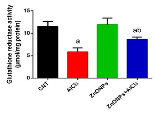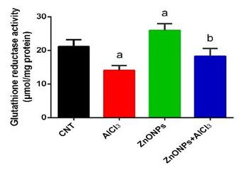To study the oxidative reactions following AlCl3-intoxication and the potential antioxidant activity of ZnO NPs, the present results determined the levels of oxidants and antioxidants in the liver and kidney homogenates. As depicted in fig. 2, AlCl3 treatment caused a significant (p<0.05) elevation in lipid peroxidation in terms of MDA and also, nitrate/nitrite levels while GSH content was depleted as compared with the corresponding control values. In contrast, ZnO NPs administration suppressed significantly elevated oxidants and increased GSH levels when compared against the AlCl3-treated group. Moreover, AlCl3 exposure inhibited significantly (p<0.05) the cellular antioxidant defense enzymes, including SOD, CAT, GPx, and GR, when compared versus the control values. However, the activity of these antioxidant enzymes was significantly restored toward the control value in ZnO NPs-pretreated rats (fig. 3); which reflects its antioxidant capacity against AlCl3-induced oxidative damage in the hepato-renal tissue.