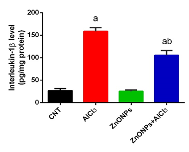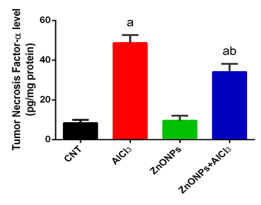 The present results showed that the accumulation of Al in the liver and kidney was found to be associated with the progression of an inflammatory response. AlCl3-treated rats exhibited a significant increase (at p<0.05) in the production of the pro-inflammatory cytokines namely; TNF-α and IL-1β concerning their control rats. Interestingly, the levels of these inflammatory cytokines were recovered towards normal values in the ZnO NPs and AlCl3 co-administered group (fig. 4).