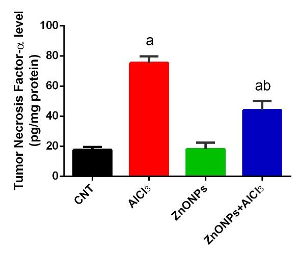 Fig. 4: Effect of zinc oxide nanoparticles (ZnO NPs) and/or aluminum chloride (AlCl3) after daily treatment for 6 w, on interleukin-1β (IL-1β) tumor necrosis factor-α (TNF-α) and levels in liver and kidney of adult male rats. Data are expressed as the mean±SD (n = 7). a p<0.05 vs. the control group; b p<0.05 vs. the AlCl3-treated rats using Tukey post hoc test