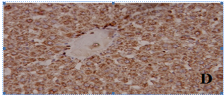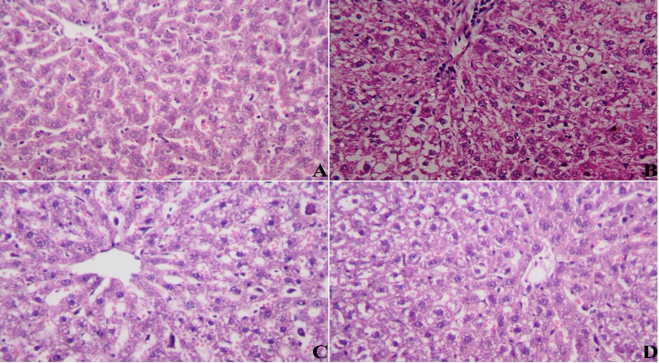 Fig. 5: Photomicrographs of liver tissue. Where A) represents control, B) aluminum chloride (AlCl3), C) zinc oxide nanoparticles (ZnO NPs) and D) aluminum chlorid (AlCl3)+zinc oxide nanoparticles (ZnO NPs)