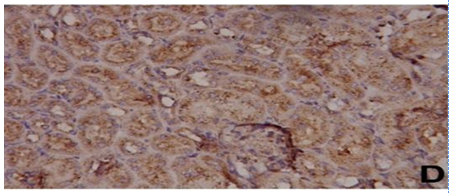 Fig. 6: Photomicrographs of kidney tissue. Where A) represents control, B) aluminum chloride AlCl3), C) zinc oxide nanoparticles (ZnO NPs) and D) aluminum chloride (AlCl3)+zinc oxide nanoparticles (ZnO NPs)