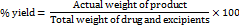 Prepared microballoons were collected and weighed. The weight of microballoons was divided by the total weight of all the nonvolatile components that were used in the preparation of the microballoons and multiplied by 100, which gives the % yield of microballoons. Percentage yield of floating micro balloons is represented by following formula.