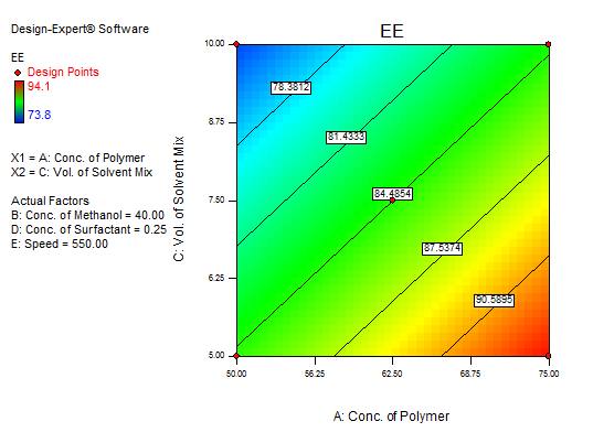 The influence of different formulation and process parameters on the drug entrapment efficiency was plotted as contour plots using Design Expert software shown in fig. 1 and 2. It was depicted from fig. 1 that the drug entrapment efficiency was found to increase with the increase in the concentration of polymer which might be attributed to the stronger polymer matrix at higher amounts of polymer, which might hold the drug tightly and hinder the leakage of the drug, thus finally resulting in increased entrapment efficiency. The results obtained were correlated with those reported by Krishnamachari Y et al. [22]. Upon an increase in the concentration of methanol in the internal phase, the rate of evaporation might be decreased because of the higher melting point of methanol than that of diethyl ether. During slow evaporation for longer time, more amount of drug might be diffused out of the microspheres thus resulted in decreased entrapment efficiency.