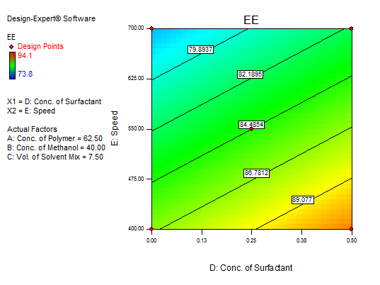 Fig. 2: Contour plot of effect of surfactant concentration and speed on entrapment efficiency