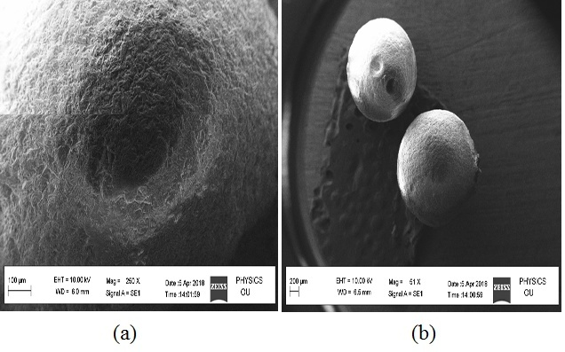 Fig. 3:SEM images of floating microspheres of formulation F34 indicating a) Surface morphology and b) Surface dents that indicate inside of the microspheres is hollow