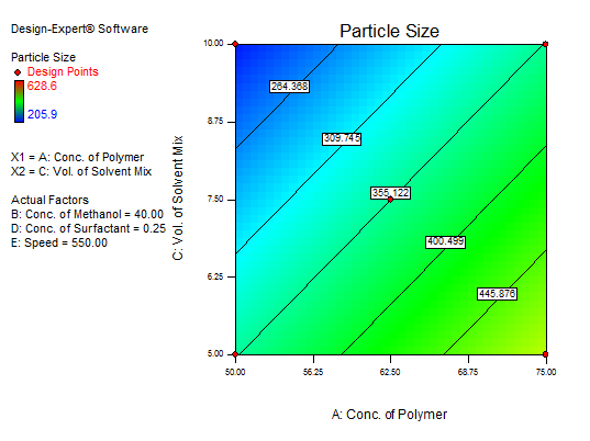 Fig. 4: Contour plot showing the effect of polymer concentration and volume of internal phase on particle size