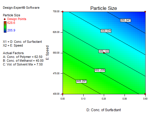 Fig. 5: Contour plot showing the effect of concentration of surfactant and speed on particle size