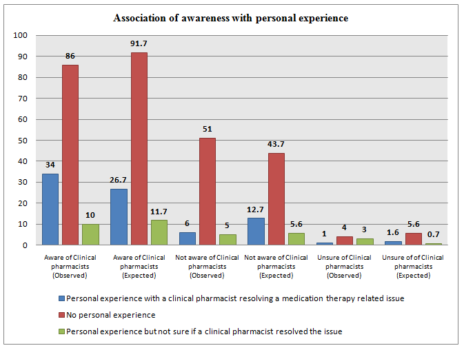 In addition to this, the perception of awareness was also tested with care givers’ personal experience with a clinical pharmacist resolving any medication therapy related issue during patient treatment. The chi square test found a significant association between the two (P value <0.01) as the number of care givers personally witnessing a clinical pharmacist resolving a medication issue was reported at N = 34 against hypothetical expected number of N = 26.7. At the same time, the number of care givers not having any personal experience with a clinical pharmacist resolving any medication issue seemed to drop and was reported at N = 86 against an expected count of 91.7. Fig. 3 describes the findings.