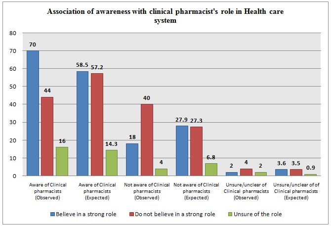 Finally, the awareness was tested for association with opinion regarding the role of clinical pharmacists in the health care system and a significant association was observed (P value <0.01). A surge in the number of the care givers aware of clinical pharmacists and believe in their strong in the health care system was evident N = 70 as compared to the expected hypothetical number of N = 58.5. Additionally, the number of those aware care givers not believing in a strong role of the clinical pharmacist in the health care system dropped to N = 44 as compared to the expected N = 57.2. The details are illustrated in Figure 4 and a summary of the associations between variables is tabulated in table 2.