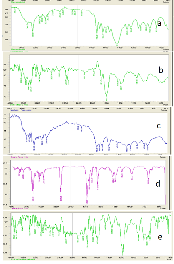 Fig. 1: FTIR spectra of (a) Racecadotril. (b) Racecadotril+Chitosan (c) Racecadotril+Xanthan gum (d) Racecadotril+Guar gum (e) Racecadotril+Chitosan+Xanthan