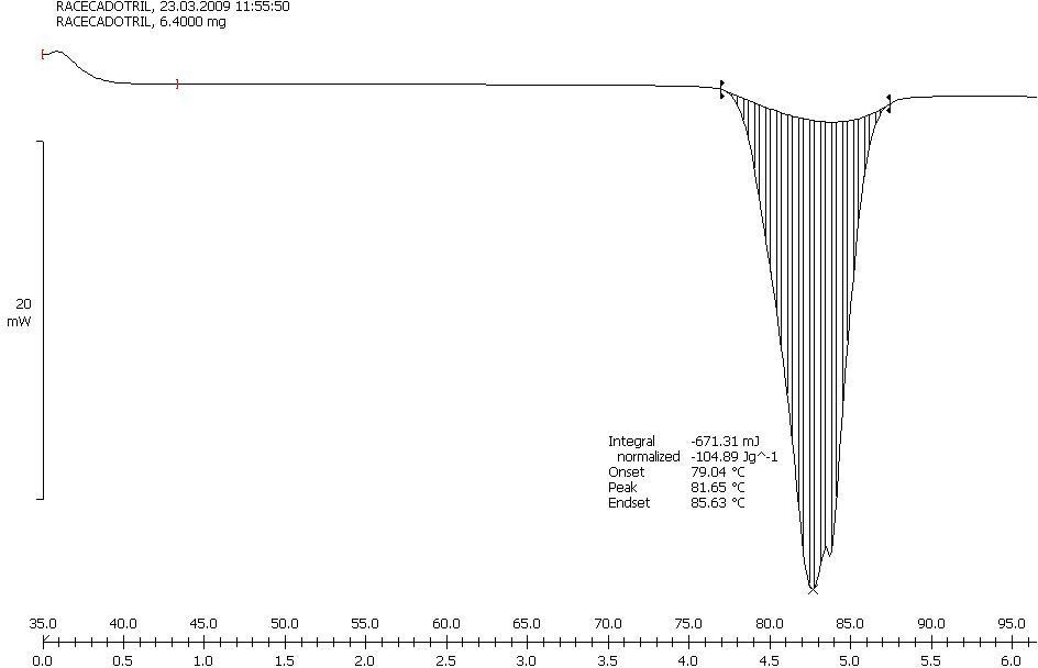 DSC thermograph of a given sample of Racecadotril is shown in fig. 2. The thermogram showed the Endothermic peak at 85.63 °C which is near to the actual melting point of the Racecadotril, from this it confirmed that the received gift sample of a drug is of Racecadotril.
