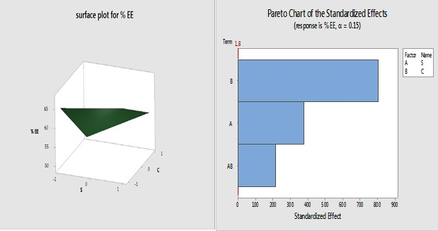 Fig. 3: Surface plot and pare to chart of % entrapment efficiency