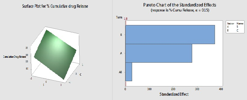Fig. 5: Surface plot and pare to chart of % cumulative drug release
