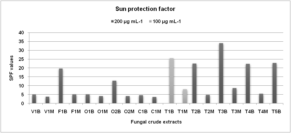 Fig. 1: Sun protection factor of the fungal extracts, SPF values were calculated using Mansur equation (equation 2) and expressed in fig. 1. (n=1)