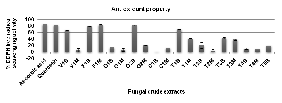 Fig. 2: DPPH free radical scavenging activity of the fungal extracts, the % antioxidant activity was calculated using equation 3 and expressed as mean±standard error to the mean (n=2)