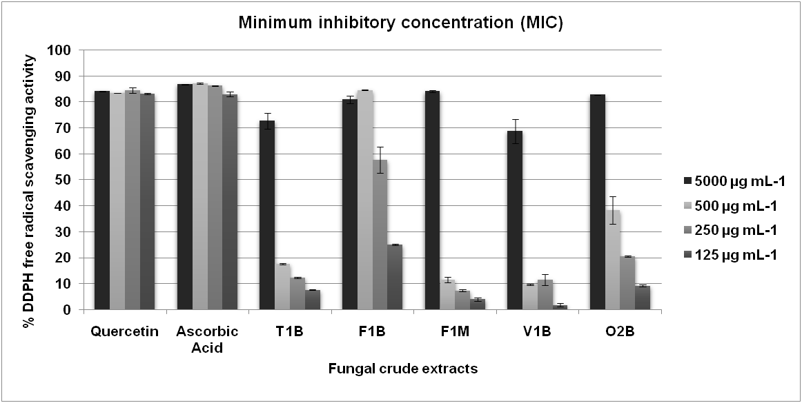 Ascorbic acid and Quercetin were used as a positive control in this study which showed as 85.83% and 83.09% DPPH free radical scavenging activity respectively. Broth of P. florida, F. velutipes, P. ostreatus, TERI-G1 showed comparable scavenging activity as positive control with values of 79.51, 66.8, 82.02 and 69.58% respectively. Broth of P. florida, F. velutipes, P. ostreatus and TERI-G1-B showed MIC at 1250, 3552.89, 2418.9 and 3219 µg. ml-1. Mycelia of P. florida showed MIC at 2903.76 µg. ml-1.