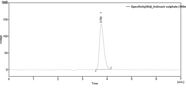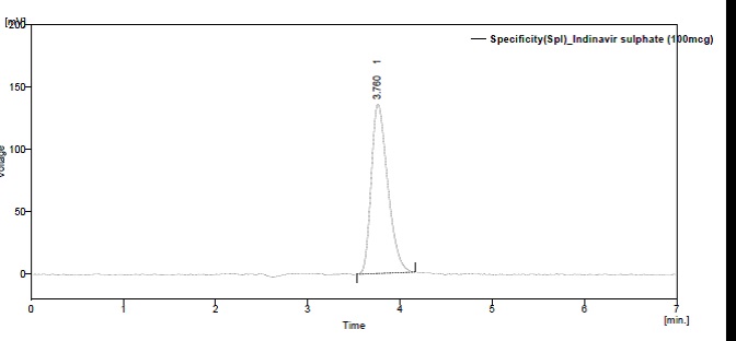 Fig. 3-5 for blank, standard drug solution and sample chromatogram reveal that the peaks obtained in the standard solution and sample solution at working concentrations are only because of the drugs as blank has no peak at the retention time of Indinavir sulphate. Accordingly it can be concluded that, the method developed is said to be specific.