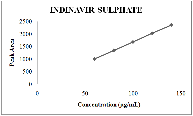 Standard solutions of Indinavir sulphate at different concentrations level were prepared. Calibration curve (Fig.6) was constructed by plotting the concentration level of drug versus corresponding peak area. The results show an excellent correlation between peak area and concentration level of drug within the concentration range (60-140µg/ml) for the drug and the results are given in table 4. The correlation coefficient of Indinavir sulphate is greater than or equivalent to 0.99, which meet the method validation acceptance criteria and hence the method is said to be linear.