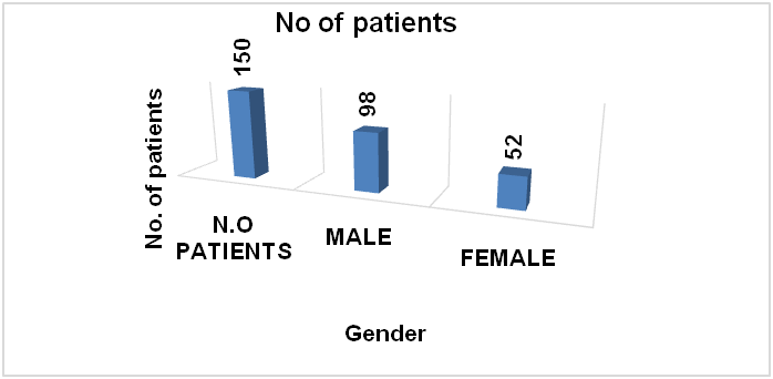 The total number of patients involved in our study were 150. The number of male patients were 98 (65.33%) and the number of female patients were 52 (34.67%) and are better illustrated using bar diagram. From the results obtained it was found out that male patients are more prone to the diseases than females in the gastroenterology department during the period of our study. The data was depicted in the form of bar diagram in fig. 1.