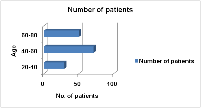 The total number of patients taken were 150. Out of these it was found that about 29 (19.33%) patients are involved with age group of 20-40 y followed by 71 (47.35%) patients are involved in age group of 40-60 y and 50(33.33%) patients in the age group of 60-80 y old. The data was depicted in the form of bar diagram in fig. 2.