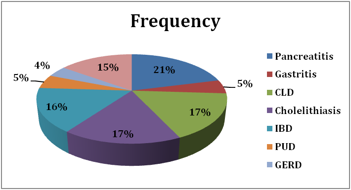 Results: Out of 150 patients, there were 98 (65.33%) male patients and 52 (34.67%) female patients. Patients between 18 and 30 y of age were 29(19.33%), between the age of 30 and 50 y were 71 (47.33%) and above 50 were 50(33.33%). Pancreatitis was most prevalent with 21% of total prevalence, followed by CLD and cholelithiasis with 17%, then IBD 16%, PUD and Gastritis 5%, GERD 4% and other diseases 15%.