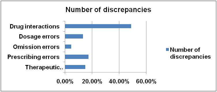 From 150 study population, the medication reconciliation was done and found 341 discrepancies from various factors. Among the factors, the drug interactions were found about 167(48.9%), prescribing errors were found to be about 60(7.5%), therapeutic duplications were found to be about 52(15.2%), dosage errors were found to be about 46(13.48%) and omission errors were found to be about 16(4.6%). Out of which the drug interactions were found to be more in prescriptions. The data was depicted in the form of bar diagram in fig. 4.