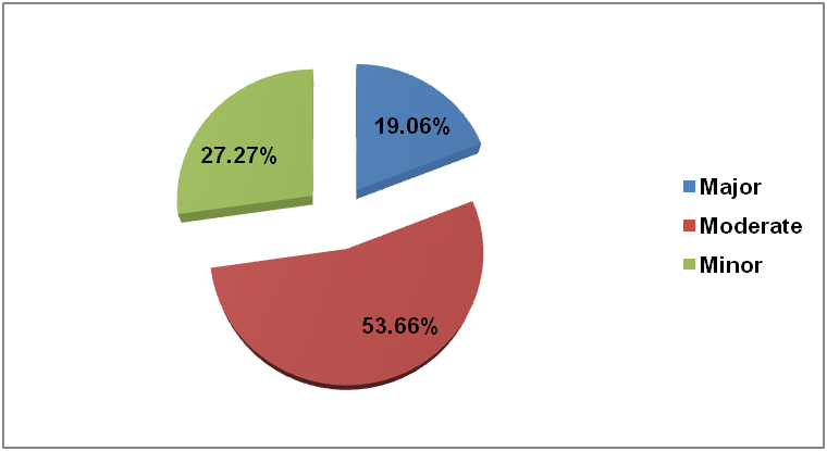 The above table shows the type of severity found in the total number of discrepancies in which the moderate type of discrepancies was found to be the highest 183(53.66%). Minor and major discrepancies were 93(27.27%) and 65(19.06%) respectively. The data was tabulated in table no: 5 and depicted in the form of pie diagram in fig. no: 5. The above table shows the type of severity found in the total number of discrepancies in which the moderate type of discrepancies was found to be the highest 183(53.66%). Minor and major discrepancies were 93(27.27%) and 65(19.06%) respectively. The data was tabulated in table 1 and depicted in the form of pie diagram in fig. 5.
