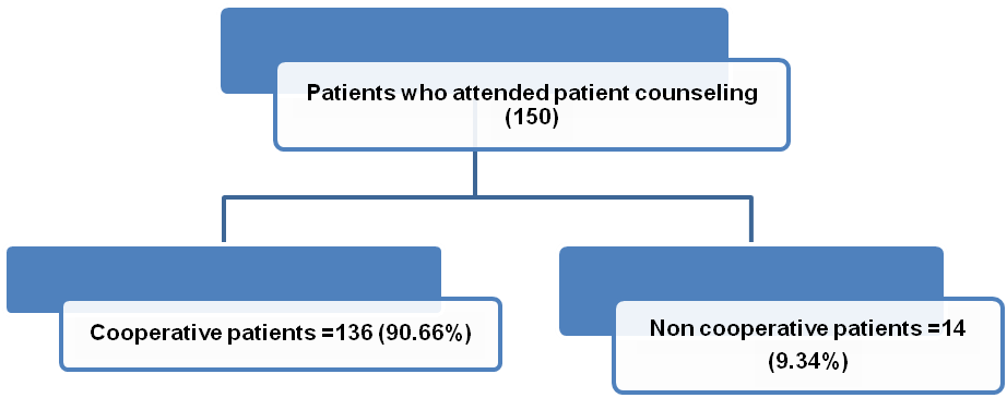 Out of these, 274 (80.35%) discrepancies in 60 (73.1%) patients are accepted. Followed by 67(19.65%) discrepancies in 15(18.2%) patients are not accepted and 0% of discrepancies in 7(8.5%) patients. Mean and standard deviation found to be 1.90667 and 0.935378 respectively. The data was tabulated in table 3. The number of patients who attended for patient counselling were 150, from which 136(90.66%) patients were cooperative and 14(9.34%) patients were non cooperative. Those who responded were benefitted. The data was depicted in fig. 7.