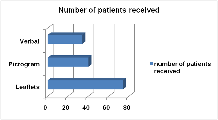 We followed a total of 136 patients out of which 100 patients responded to patient counselling, and 36 patients did not respond to patient counselling. Out of the 100 people who responded to patient counselling 86 patients improved their outcome of treatment. From the results it showed that most of the patients were benefitted from patient counselling and improved quality of life. Out of 150 patients, 74 patients received leaflets has counselling aids, 40 patients received pictograms, 34 patients were counselled verbally regarding disease and drug-based condition of the patient for better health care. The data was depicted in the form of bar diagram in fig. 8.