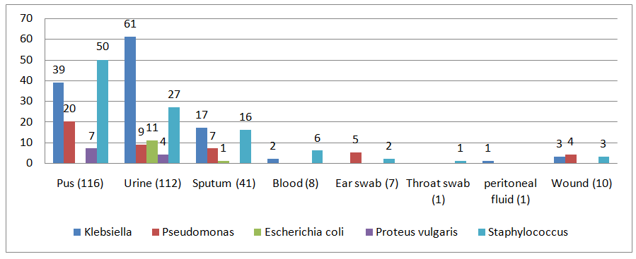The positive isolates are obtained from following samples: Urine (112*), Pus (116*), Sputum (41*), Blood (8*), Ear swab (7*), Throat swab (1*), Peritoneal fluid (1*) & Wound (10*).