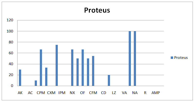 Proteus was resistant to Cephalothin (100%), Nalidixic acid (100%), Cefaolin (75%), Cefipime (66%), Norfloxacin (66%), Ofloxacin (66%).