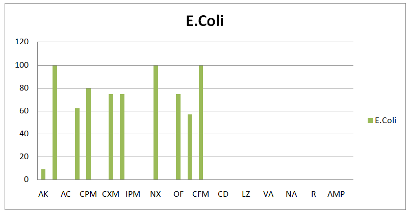 Escherichia coli was resistant to Cefixime (100%), Nalidixic acid (100%), Ceftazidime (100%), Cefipime (80%), Cefuroxime (75%), Cefazolin (75%) and Ofloxacin (75%). This was also identical to Li-Yang Hsu et al [20], Mangaiarkkarasi. A et al [24] and Oteo J et al [25].