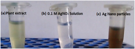 Fig. 1: Visual observations of (a) Plant extract (b) 0.1 M AgNO3 solution and (c) Silver nanoparticles