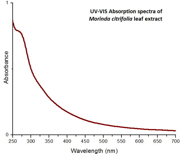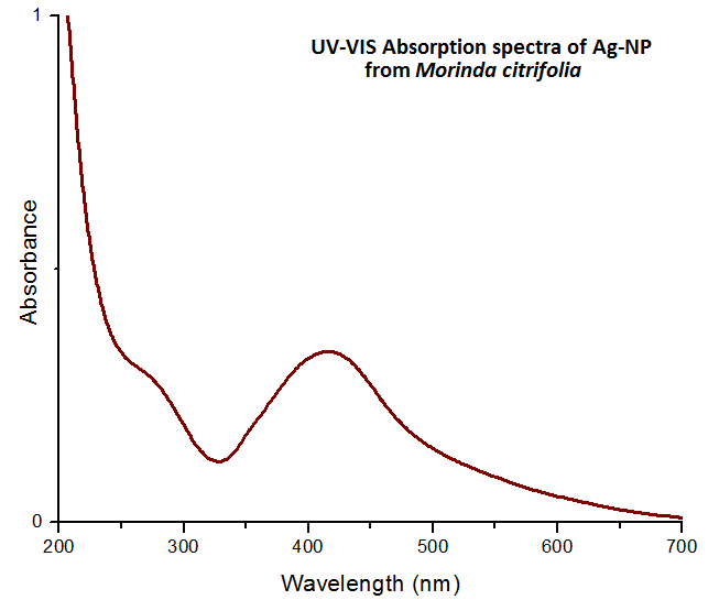 From the visual observations it was clear that the plant extract of M. Citrifolia was a good reducing agent for Ag+ ions to Silver nanoparticles. The UV-Vis absorption spectra of the Silver nanoparticles formed is shown in the fig. 2 (b). Absorption spectra of both the extract and the nanoparticles are shown which shows the formation of Silver nanoparticles with an absorption maximum at ≈ 425 nm.