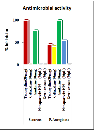 Results: The formation of Silver nanoparticles was confirmed with the help of UV-Vis absorption spectra at ≈ 425 nm and particle size as approximately 100 nm using Particle size analysis (DLS method). The anti-microbial activity of the Ag NPs so synthesized was studied against human pathogens in wound infections such as S. aureus and P. aureginosa strains. The inhibitory activity for Ag NPs was compared with those of known drugs such as tetracycline, Ceftazidime and Amikacin at 30 mcg. The inhibitory activity of the Synthesized Ag NPs was found pronounced against P. aureginosa strains.