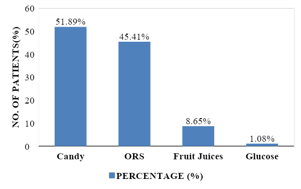 Among the patients with hypoglycemic symptoms, it occurred mostly 'once in a month' in 91(47.40%) and 'once' in 77(40.10%). Only 24(12.50%) patients had these hypoglycemic symptoms for more than once in a month. About 185(96.35%) patients had used remedies to relieve the hypoglycemic symptoms that occurred while using herbs. Among 185 patients who took remedies to relieve hypoglycemic symptoms, the frequency of patients who preferred candy was 96 (51.89%), ORS 84 (45.41%), fruit juices 16 (8.65%) and glucose 2 (1.08%), 13 patients had taken more than one remedy.