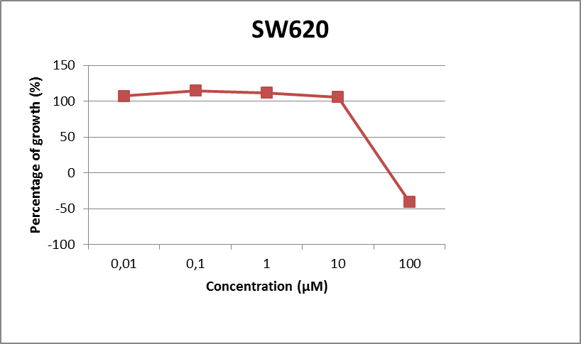 Fig. 2: The growth of SW620 tumor cells vs concentration of Na[RuCl2(N-Ph-5-Cl-salim)2]