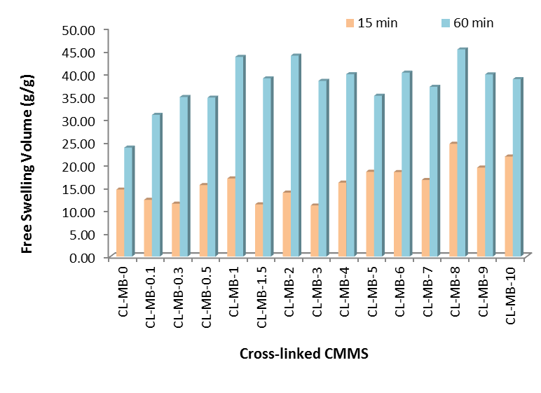 Fig. 2: Free Swelling Capacity (FSC) of CMMS and CL-MB at 15 and 60 min
