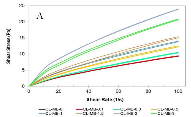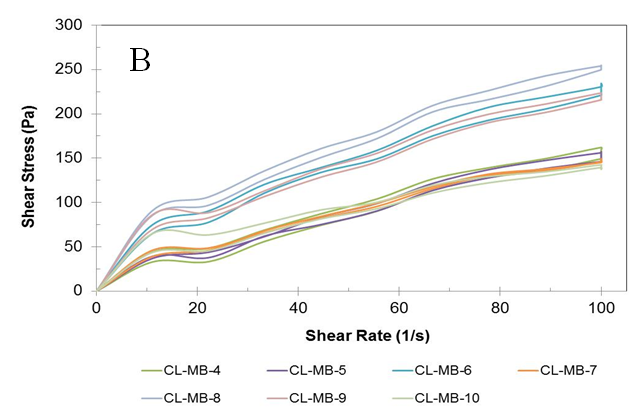 Rheological profiles of CL-MB-0 and low DCA cross-linked gel samples (CL-MB-0.1 to CL-MB-3) were essentially no different, exhibiting pseudoplastic flow patterns with a small degree of thixotropy (Fig.3A). These are consistent with previous reports on CMS [13,16]. At DCA concentrations 4% and above, gels showed high stress at low shear (up to 10 s-1) before assuming a typical shear-thinning flow. Larger values of thixotropy were observed, indicating that DCA crosslinking not only altered the viscosity but also affected the flow properties of the cross linked starch gel (Fig.3B).