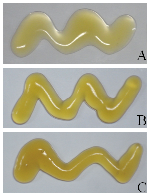 Fig. 4: Appearances of Capsicum gel prepared using (A) 5%CMMS (CL-MB-0), (B) 5% CL-MB-8, compared to (C) commercial Capsicum gel using 1% CP940 as gelling agent