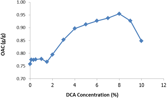 Fig. 5: Oil absorption capacity (OAC, g/g) of CL-MBs prepared using varied DCA concentrations
