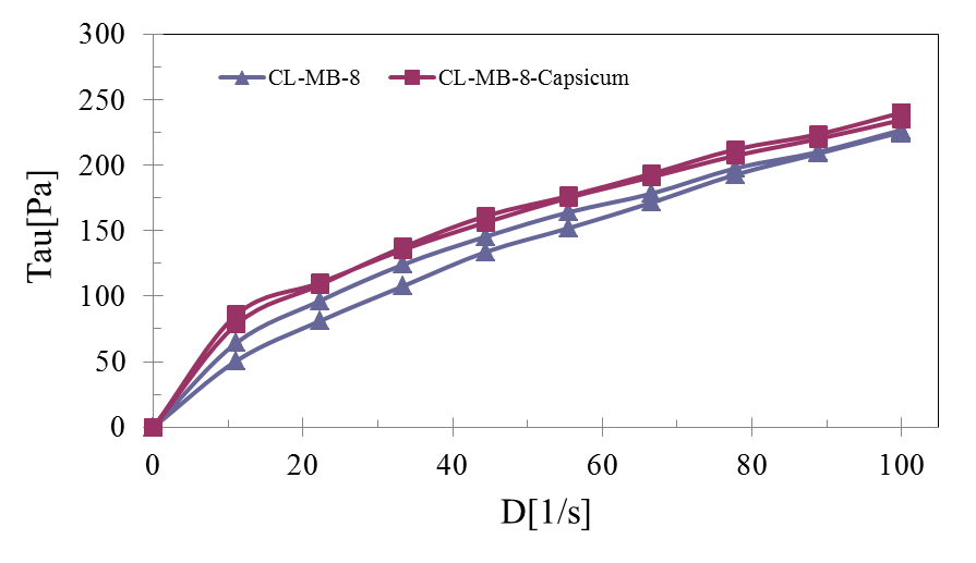 Fig. 6: Rheological profiles of emulsion formulations using CL-MB-8 as stabilizer, with (CL-MB-8-Capsicum) and without (CL-MB-8) Capsicum extract