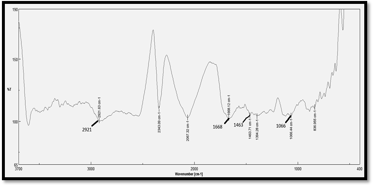 The composition of Gel is reported in the literature. It contains arabinose, xylose and rhamnose and the highest amount of uronic acid (galacturonic acid+glucuronic acid). FTIR spectrum of the dried is shown in fig. 1. The spectra exhibited all typical bands and peaks characteristic of polysaccharides. The major identical peaks are similar and in good agreement with those reported for Lepidium sativum seed mucilage. A band around 2921 cm-1 (3000-2800 cm-1) referred to C-H vibrations, which included CH, CH2 and CH3 stretching and bending vibrations, symmetric, and asymmetric and occasionally doubles overlapping with O-H. The characteristic bands around 1668 cm-1 and 1463 cm-1 were attributed to the asymmetrical and the symmetrical COO-stretching vibrations, respectively. The peak at 1066 cm-1 indicated the presence of carbohydrates [18, 19].
