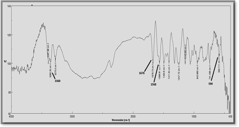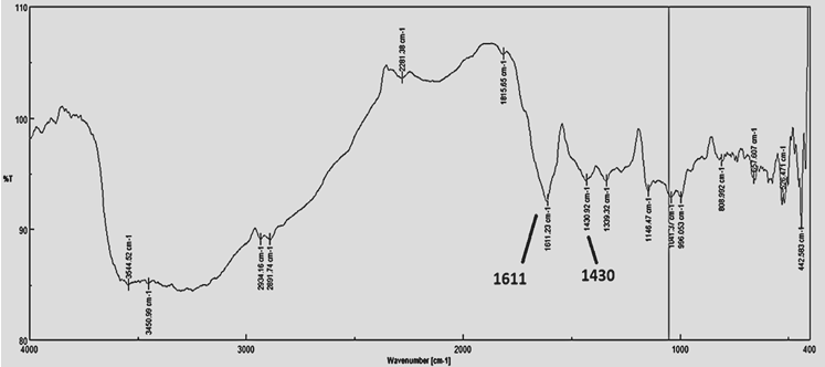 The gel was isolated from the seeds of Lepidium Sativum, and dried in hot air oven (at 80 °C for sufficient time to remove the water completely) and taken for FTIR analysis. Powder of potassium bromide (KBr) was heated for 1.5 h. to remove moisture at 160 °C. Dried Gel was mixed thoroughly with KBr in the proportion of 1:1. The FTIR spectrum was recorded using a JASCO FTIR instrument. The result was obtained in the form of a graph of % Transmittance vs. Wave no. Then the mixture was scanned over the 400-4000 cm-1.
