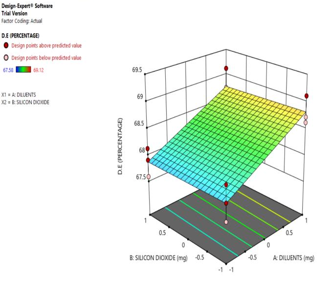The data obtained after evaluation of factorial batches were analyzed by using the demo version of commercially available software Design Expert (Version 11). To describe the response surface curvature (fig. 5), the design was evaluated by the quadratic model, which bears the form of the equation–